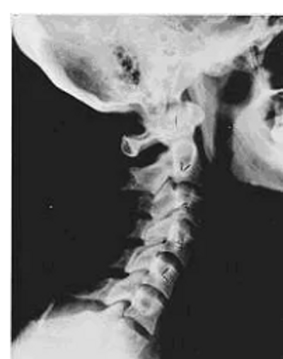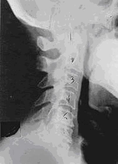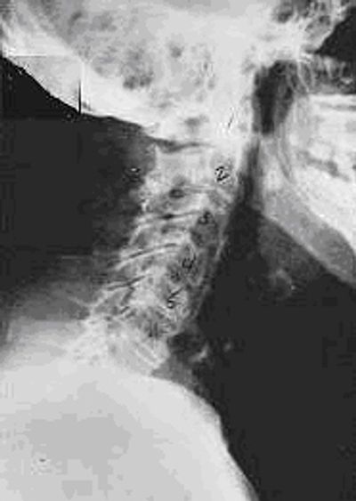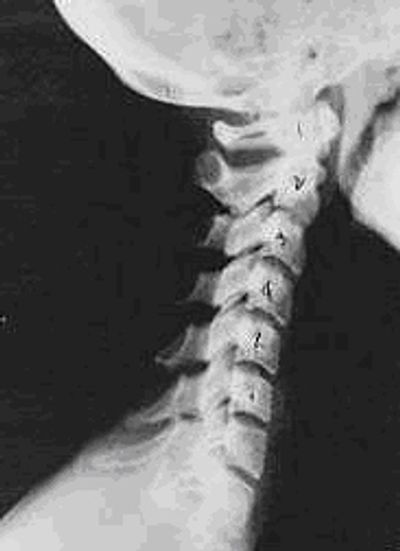 This is an x-ray view of the neck looking at the patient from the side. As with all the pictures on this page, the patient is looking to the right of the screen, so you are viewing the right side of their neck. This picture is a "near normal" spine. Compare this neck image closely with the ones you will see below. Notice the normal forward curve of the neck. This curve helps absorb shock similar to shock absorbers on your car. The white squares are called the vertebral bodies and should be clear and with well defined borders. The black spaces above and below the vertebral bodies are the discs. The discs should be thick and even. This type of arrangement is normal in the neck. Normal vertebrae in other parts of the spine also have similar characteristics to what is seen here.